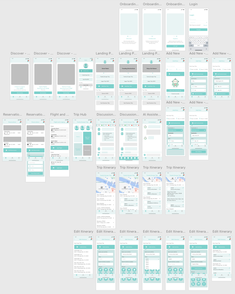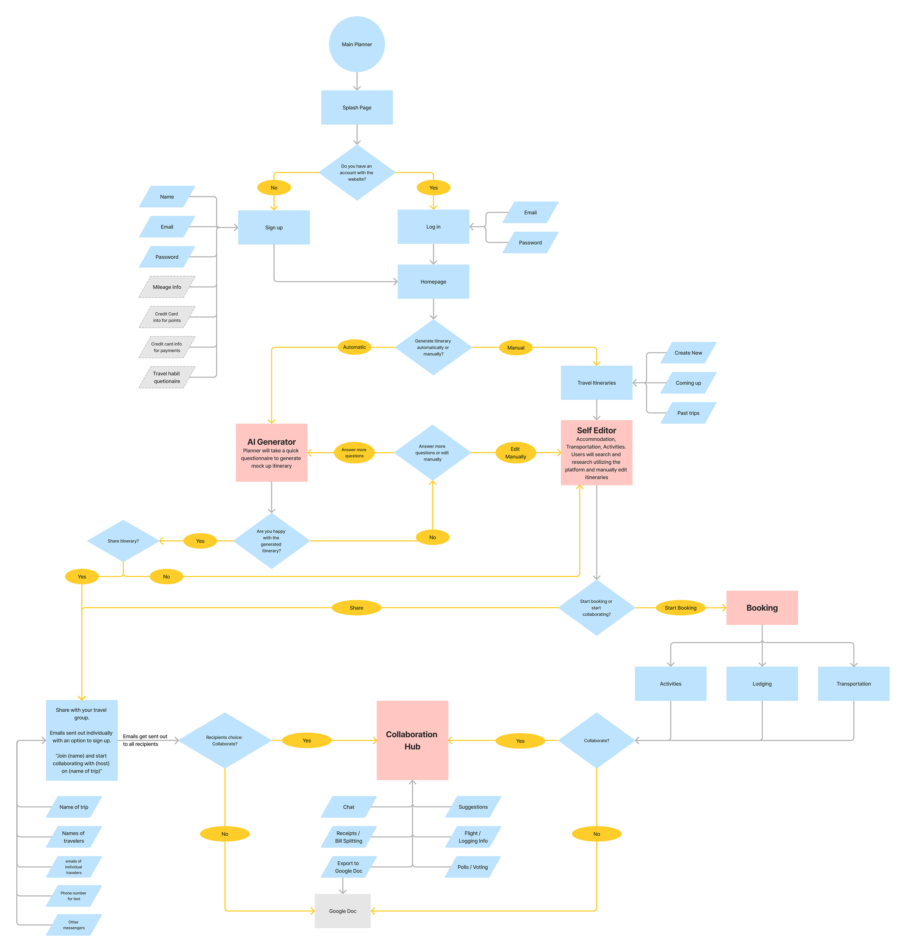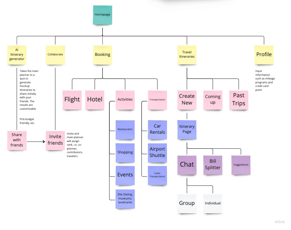 Based on my initial research, I determined that the key aspect of trip planning is collaboration. The planning phase of a trip stands out as one of the most thrilling and enjoyable moments. By enhancing the enjoyment of collaboration, individuals can amplify their overall experience. Below is a high level sitemap using the affinity map that was created after the initial user research.