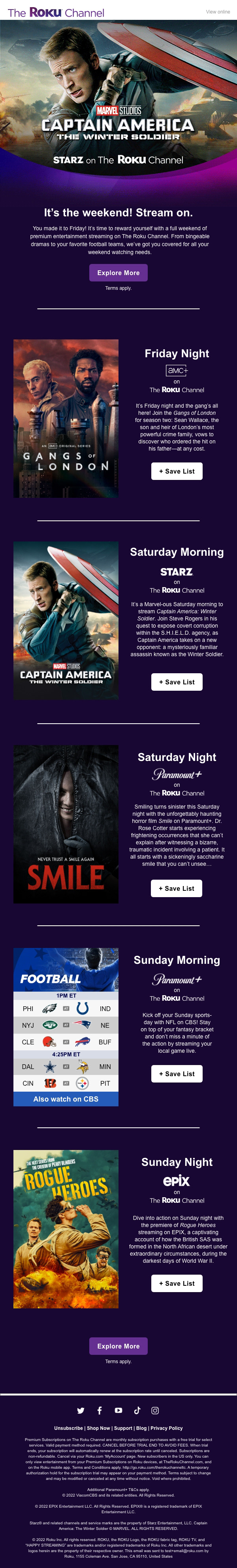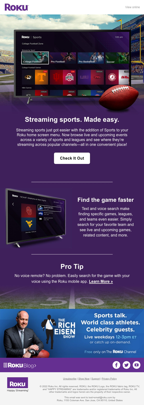 I played a key role in crafting an email design derived from a landing page, collaboratively developed with my colleague, for Roku's innovative Sports Experience Platform. My responsibility was to ensure the design captured a visually appealing and engaging aesthetic, specifically tailored to the sports-focused theme.