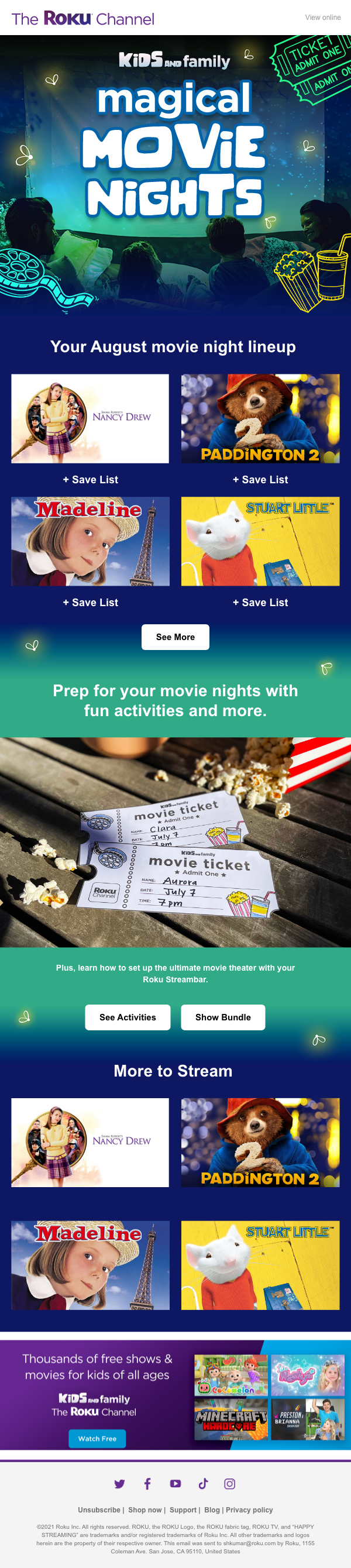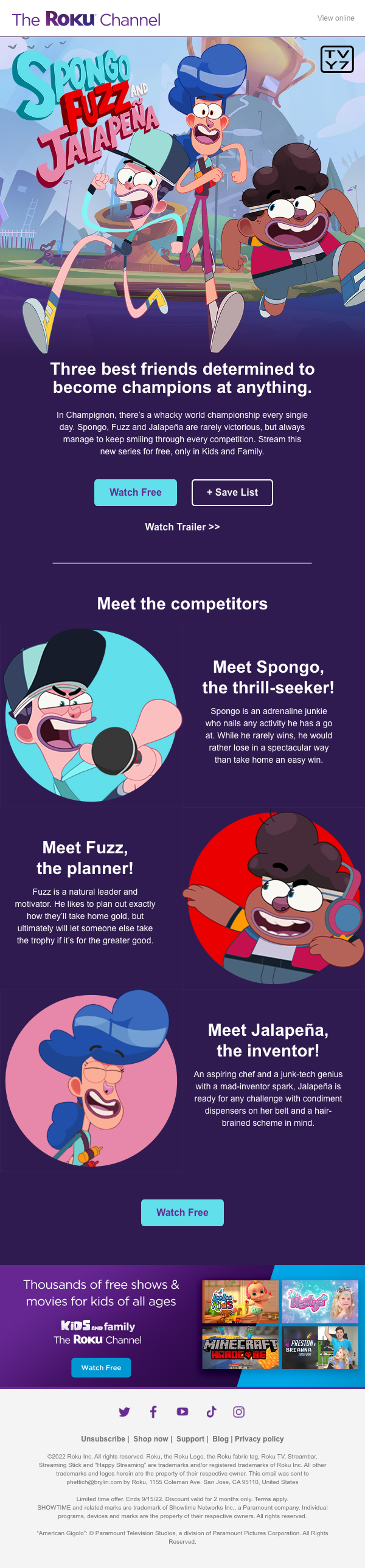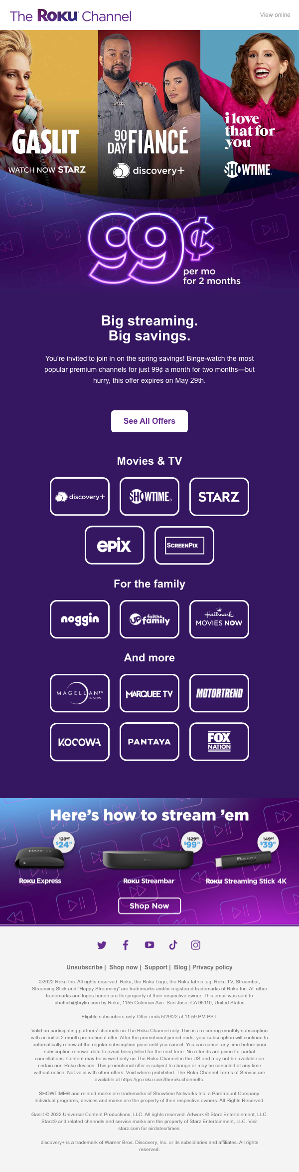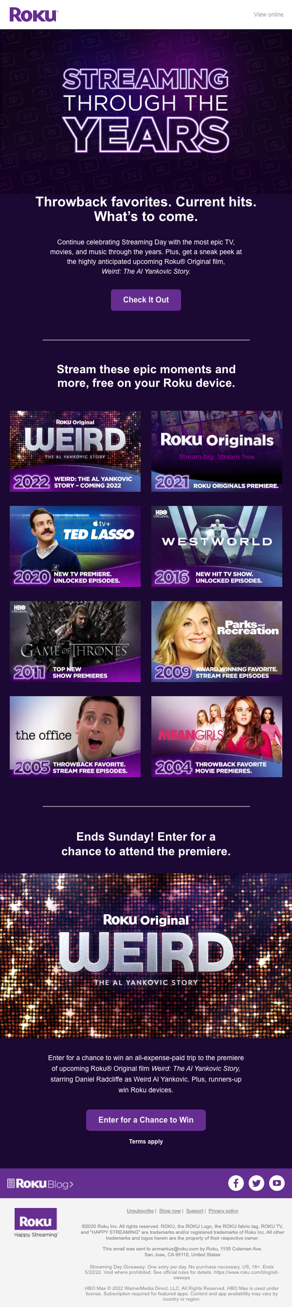 I played a role in designing the Roku Platform Giveaway skin for their annual "Streaming Day" and created promotional emails, developing aesthetically compelling designs that effectively showcase the offerings.